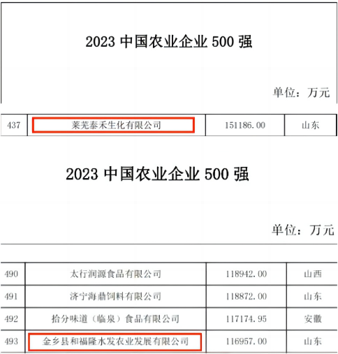 12月20日,“2023年中國農業企業500強”榜單正式發布,水發農業集團2家權屬公司首次上榜。萊蕪泰禾生化有限公司位列第437位,金鄉縣和福隆水發農業發展有限公司位列第493位。