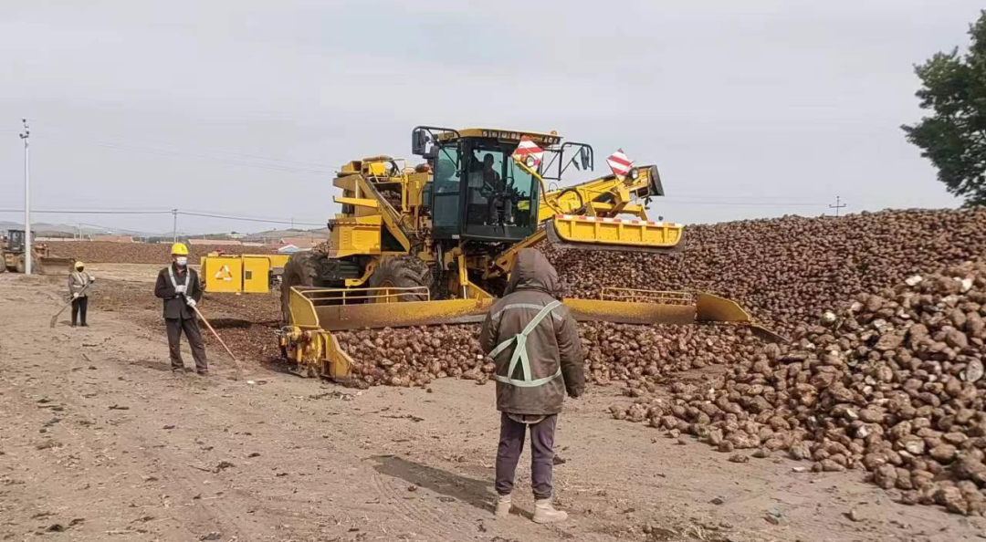 ▲內(nèi)蒙古佰惠生公司將甜菜從地頭拉回公司的堆場后進(jìn)行堆垛,圖中的羅霸機(jī)正在進(jìn)行甜菜的堆垛工作。